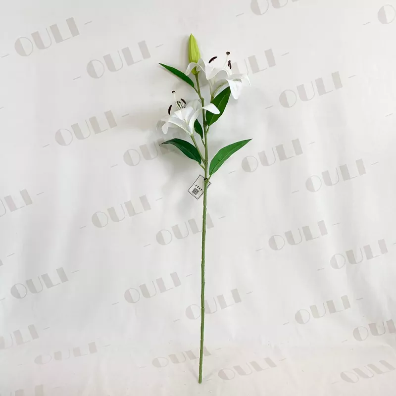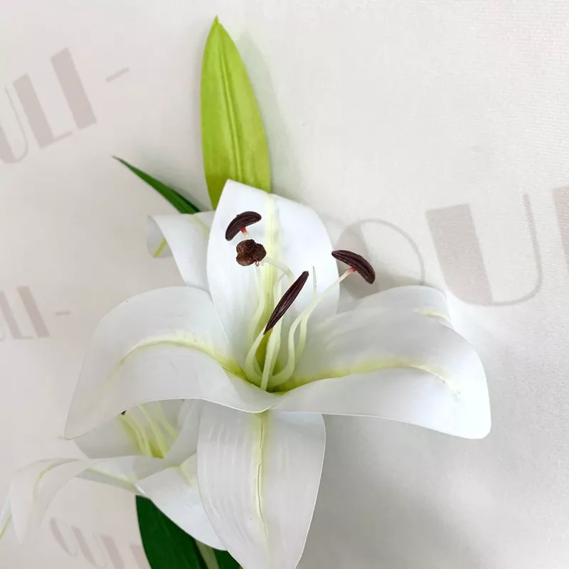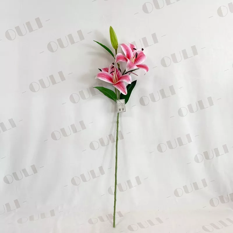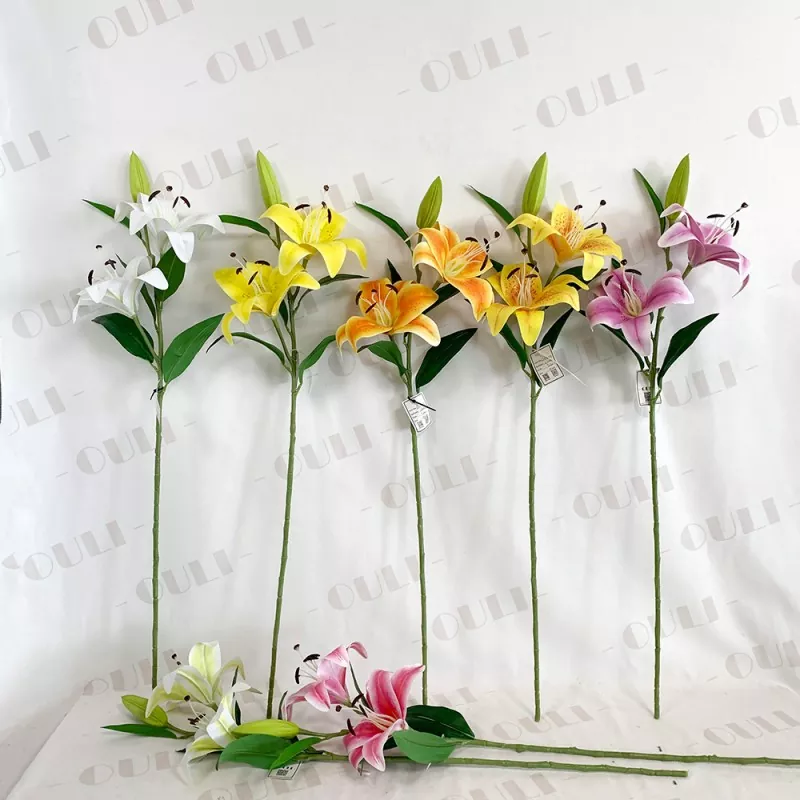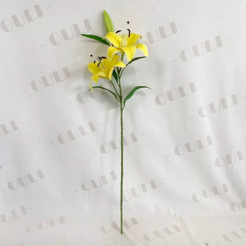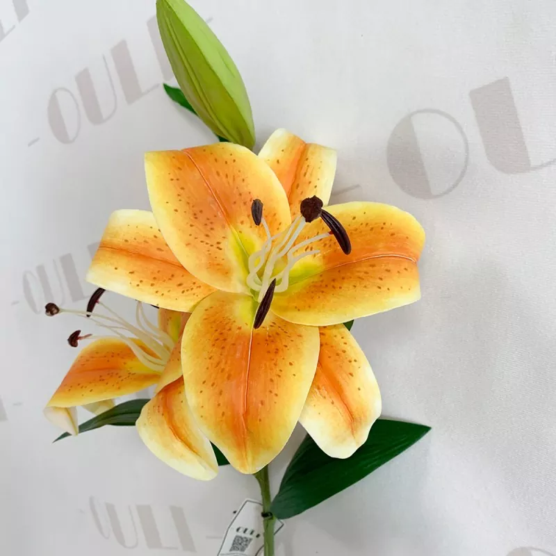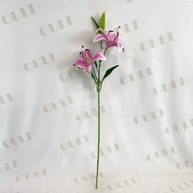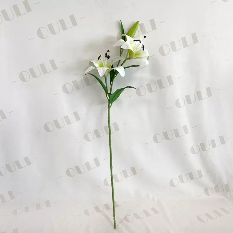 A mesterséges virágok exportjára összpontosító márka, az Ouli® elkötelezett amellett, hogy a globális ügyfelek számára olyan dekoratív virágművészetet biztosítson, amely ötvözi a szépséget és a minőséget. Ez a PU Fake Lily puha PU és nagy szimulációs selyemszövet kombinációját használja, egyenes ágakkal és teljes és természetes virágokkal. Egy ág hossza 90 cm, 2 teljesen virágzott virágot és 1 rügyet tartalmaz, ami ideális elem a modern otthoni dekorációhoz és az esküvői háttérhez. Ez a PU Fake Lily olyan nemzetközi tanúsításokat fogadott el, mint a CE/UKCA/ROHS, és alkalmas hosszú távú beltéri dekorációra.