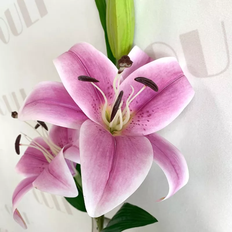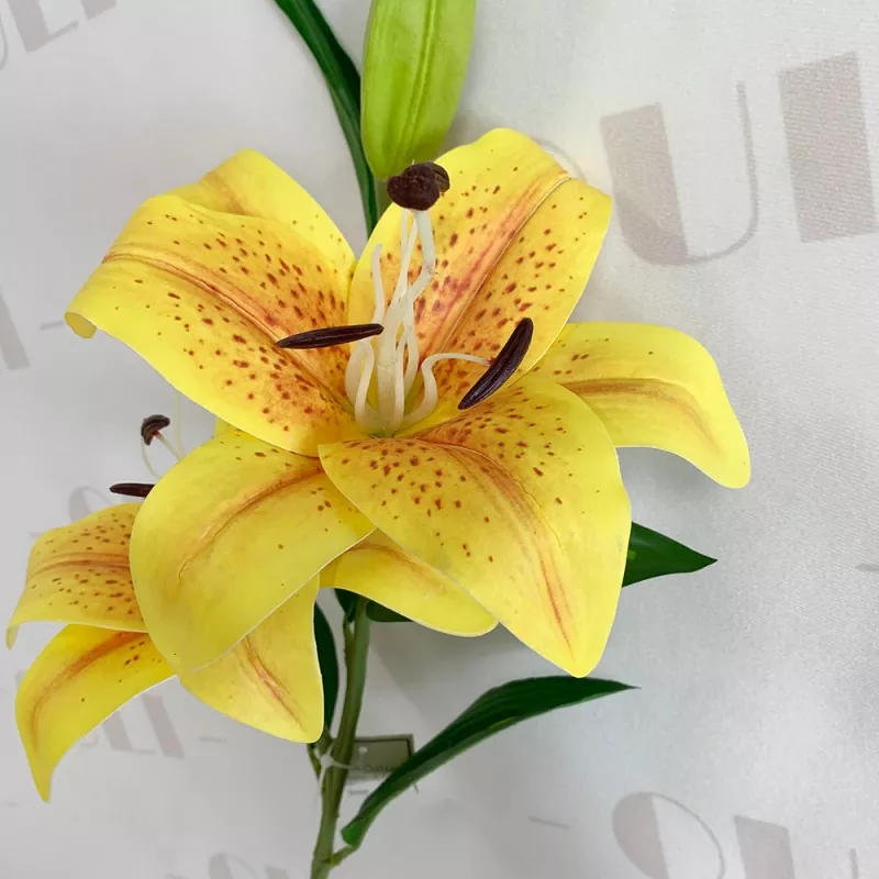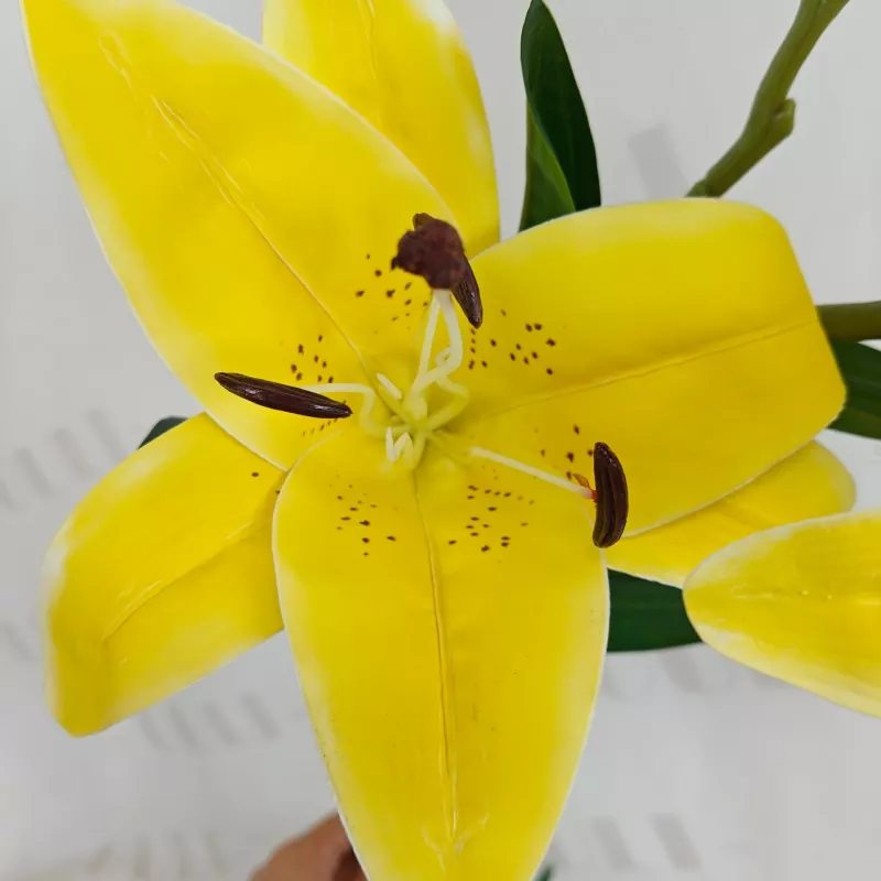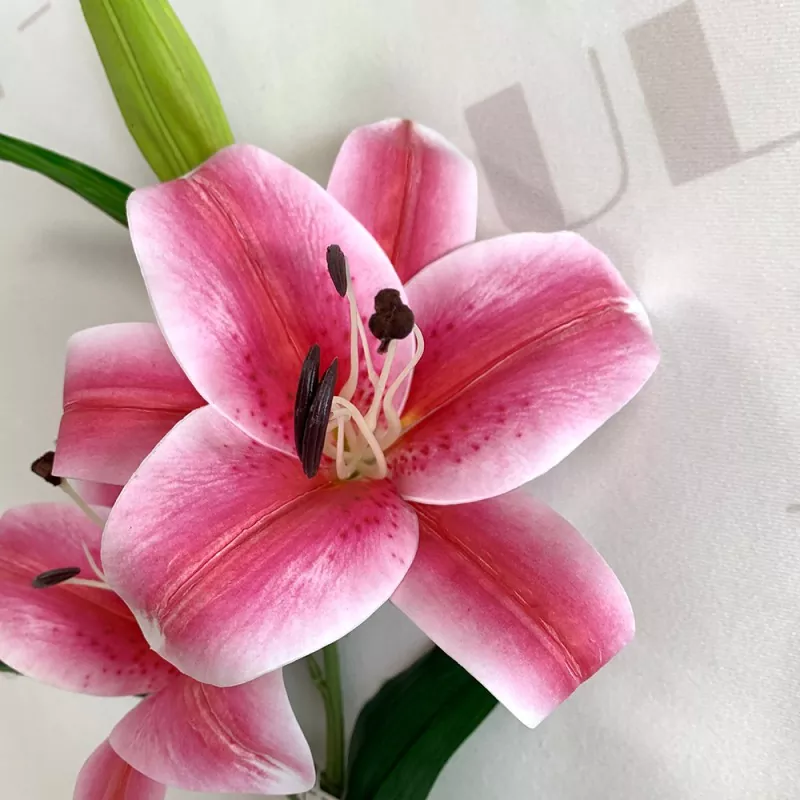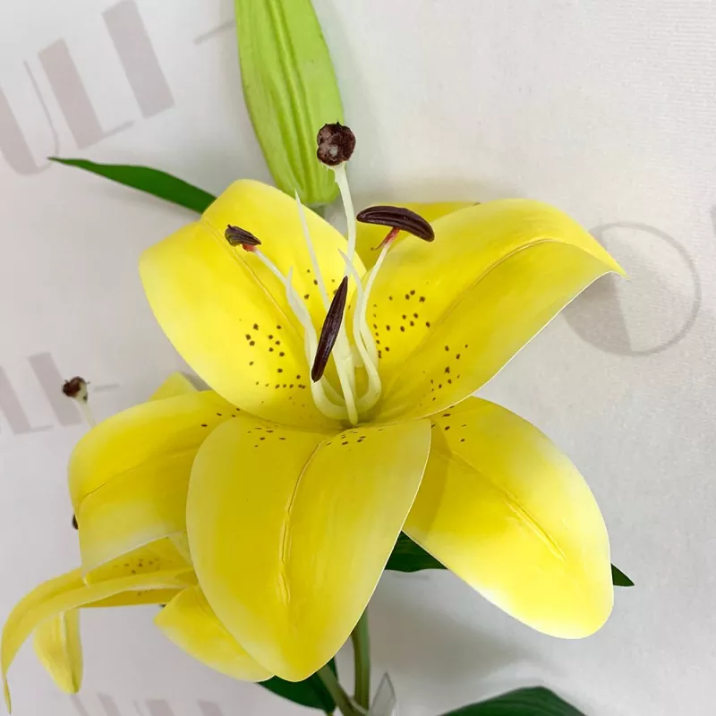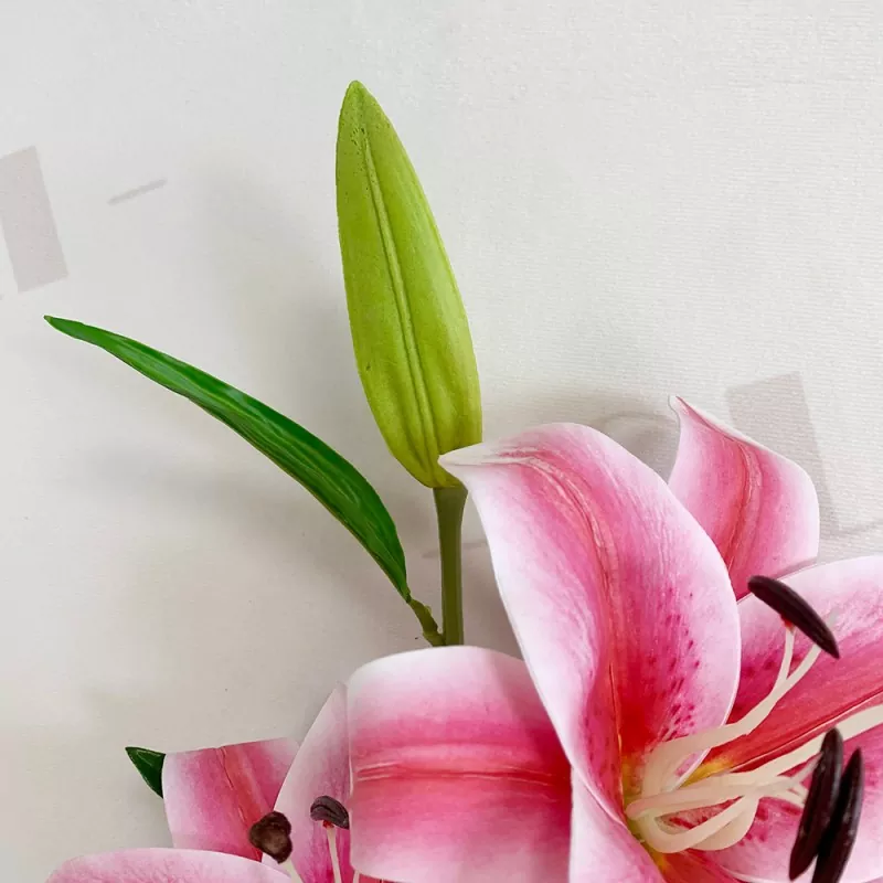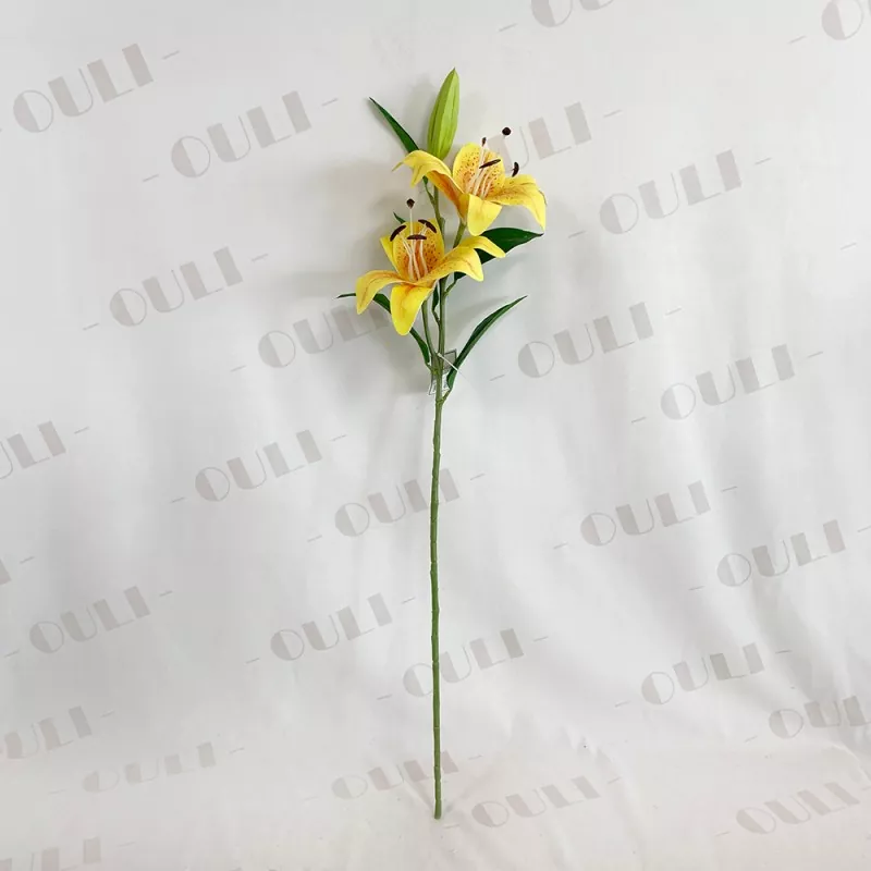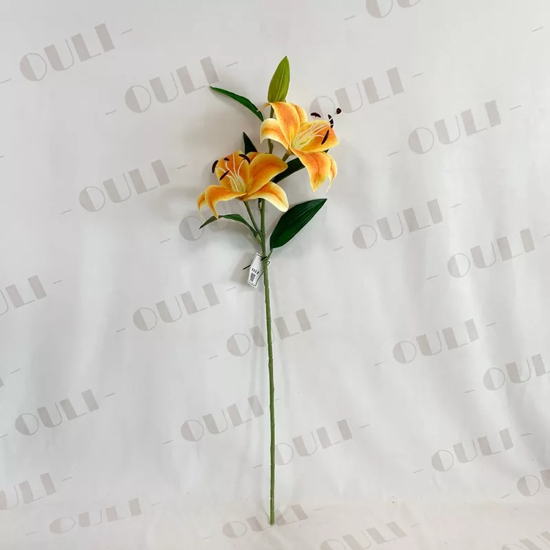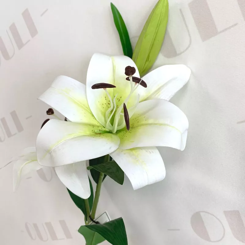 A mesterséges virágok exportjára összpontosító márka, az Ouli® elkötelezett amellett, hogy a globális ügyfelek számára olyan dekoratív virágművészetet biztosítson, amely ötvözi a szépséget és a minőséget. Ez a PU Fake Lily puha PU és nagy szimulációs selyemszövet kombinációját használja, egyenes ágakkal és teljes és természetes virágokkal. Egy ág hossza 90 cm, 2 teljesen virágzott virágot és 1 rügyet tartalmaz, ami ideális elem a modern otthoni dekorációhoz és az esküvői háttérhez. Ez a PU Fake Lily olyan nemzetközi tanúsításokat fogadott el, mint a CE/UKCA/ROHS, és alkalmas hosszú távú beltéri dekorációra.